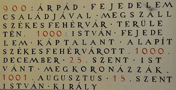 Hetvenöt évvel ezelőtti esemény elevenedik meg a Városháza nagytermében szombaton, hiszen 1938-ban az ünnepi év alkalmából a közgyűlési terem pulpitussal szemközti falát Székesfehérvár jelentős történelmi eseményeinek leírásával díszítették. A szöveg a koronázóváros történelmét követi végig 900-tól - amikor Árpád fejedelem családjával megszállt Székesfehérvár területén - egészen 1919-ig. A felirat időrendi sorrendben mintegy 60 évszámot és eseményt tartalmaz.