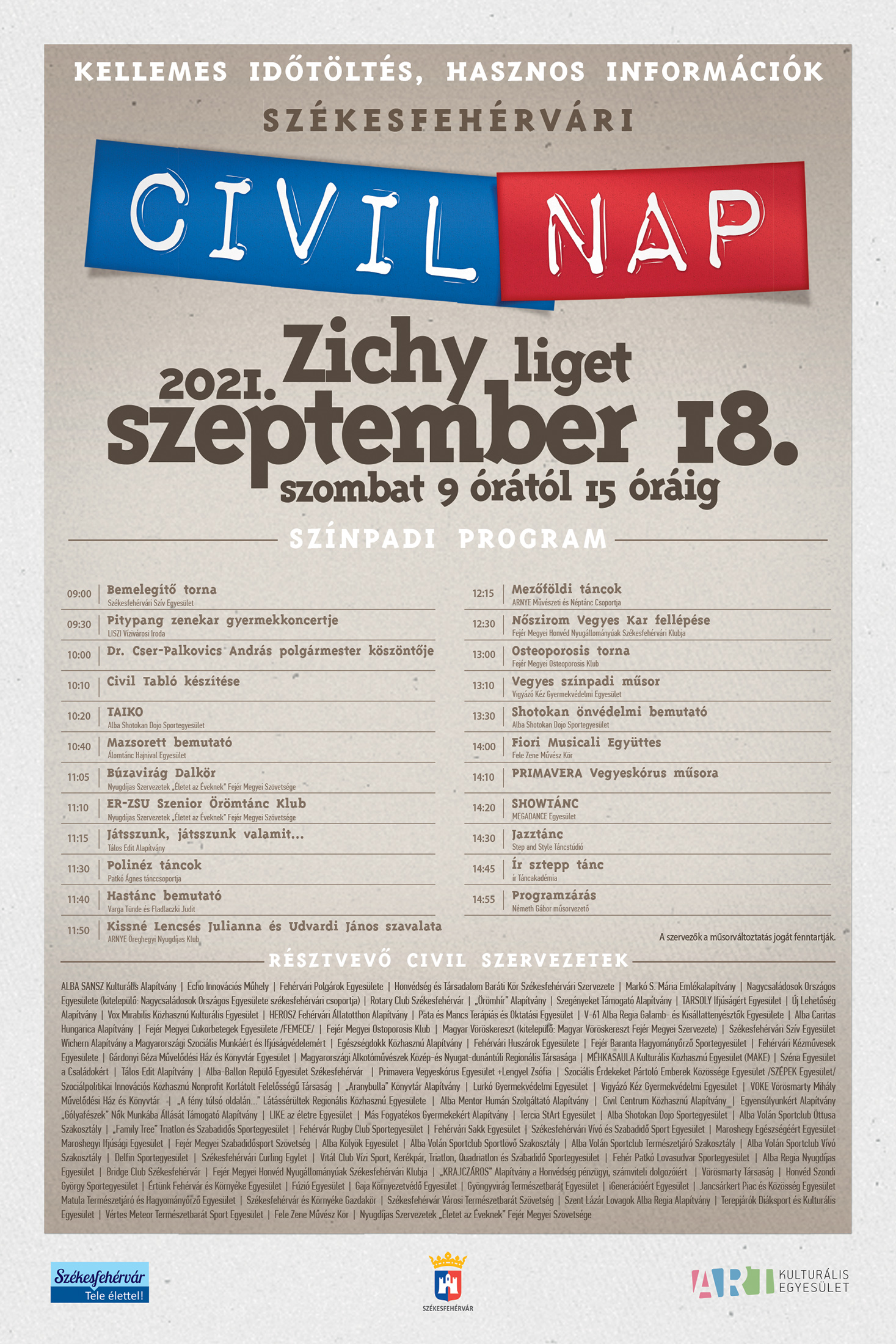 Pisch Norbert, az ART Kulturális Egyesület elnöke felidézte, hogy a fehérvári civil szervezetek egyre nagyobb számban képviseltetik magukat a Civil Napokon, korábban féltek, hogy a Zichy liget "túl nagynak" bizonyul a rendezvényhez, mára azonban teljesen "belakták" ezt a teret.