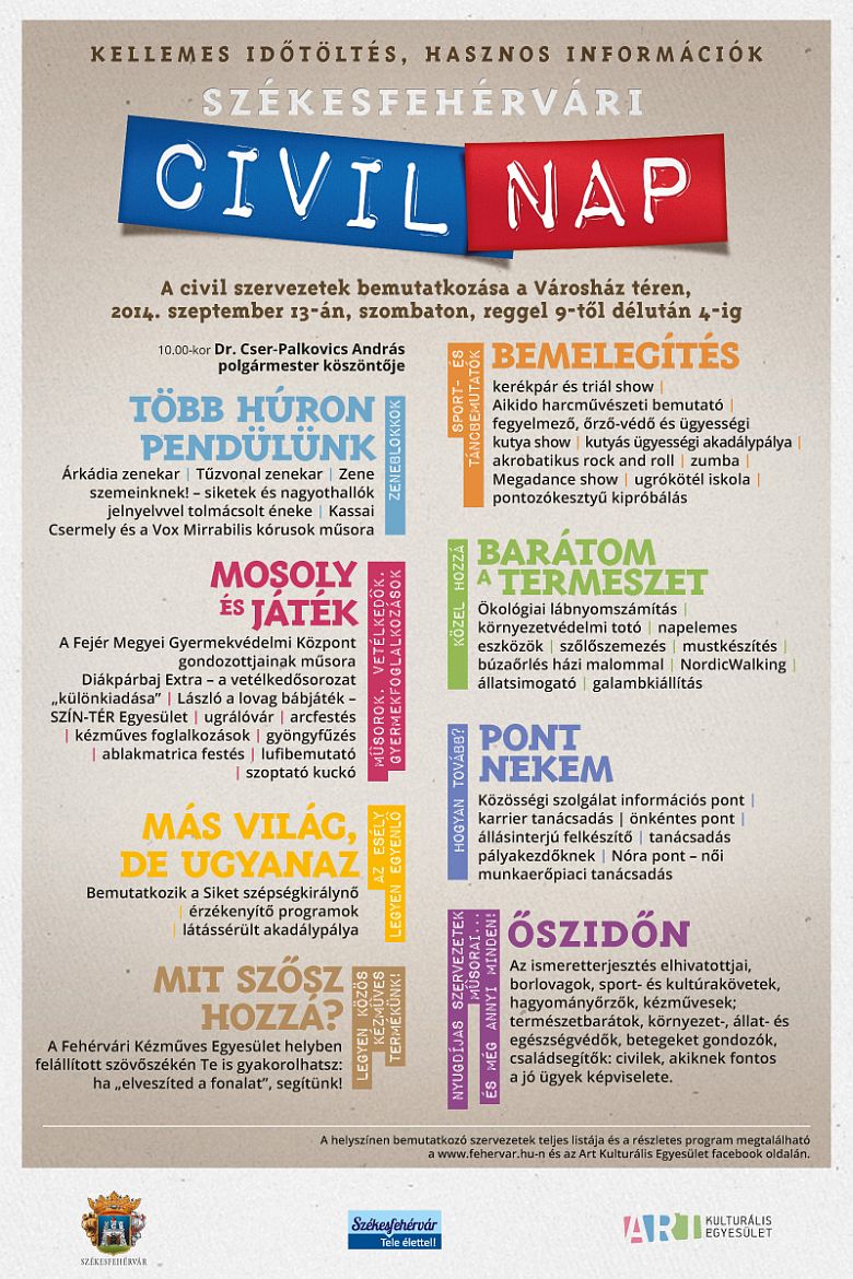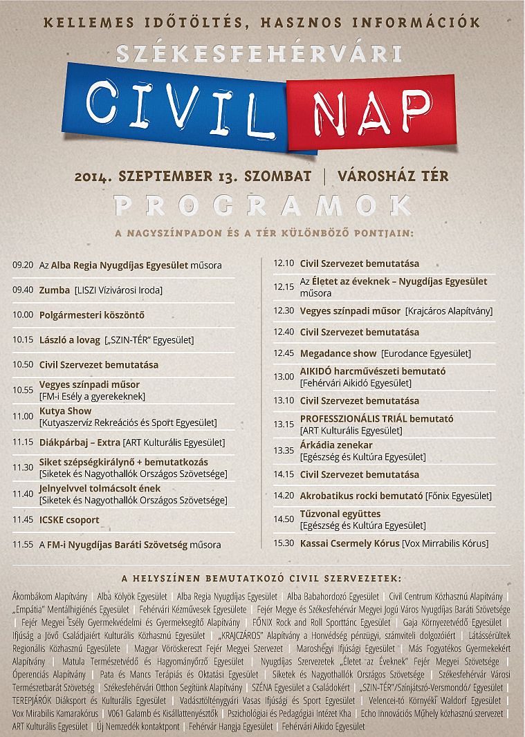 Zentai Zsolt a Polgármesteri Hivatal Civil Irodájának vezetője elmondta, hogy a fehérvári civilek szolgáltatásait egy helyen ismerhetik meg a fehérváriak. Összesen 31 civil szervezet fogadta el a meghívást a szeptember 13-i Civil Napra, melyre a város önkormányzata összesen egymilliós keretet biztosít a szervezeteknek a kitelepüléshez, de sátrakat és sörpadokat, asztalokat is adnak.