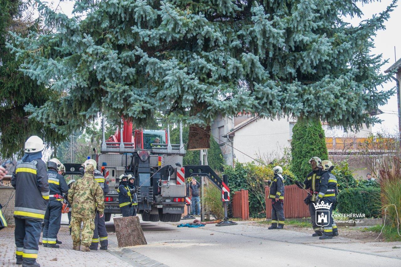 Hétfőn reggeltől nagy volt a készülődés a Surányi utcában, ahol az E.ON szakemberei a székesfehérvári tűzoltókkal és a Magyar Honvédség katonáival készítették elő a terepet a fenyőfa biztonságos kiemeléséhez és szállításához. A 40 éves, 16 méter magas ezüstfenyőt először felülről egy daru segítségével rögzítették, majd a kivágást követően egy kamion platójára fektetve felkészítették a szállításra.%%GALLERY62030%%