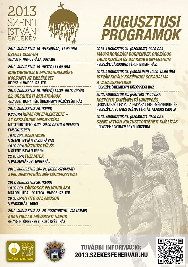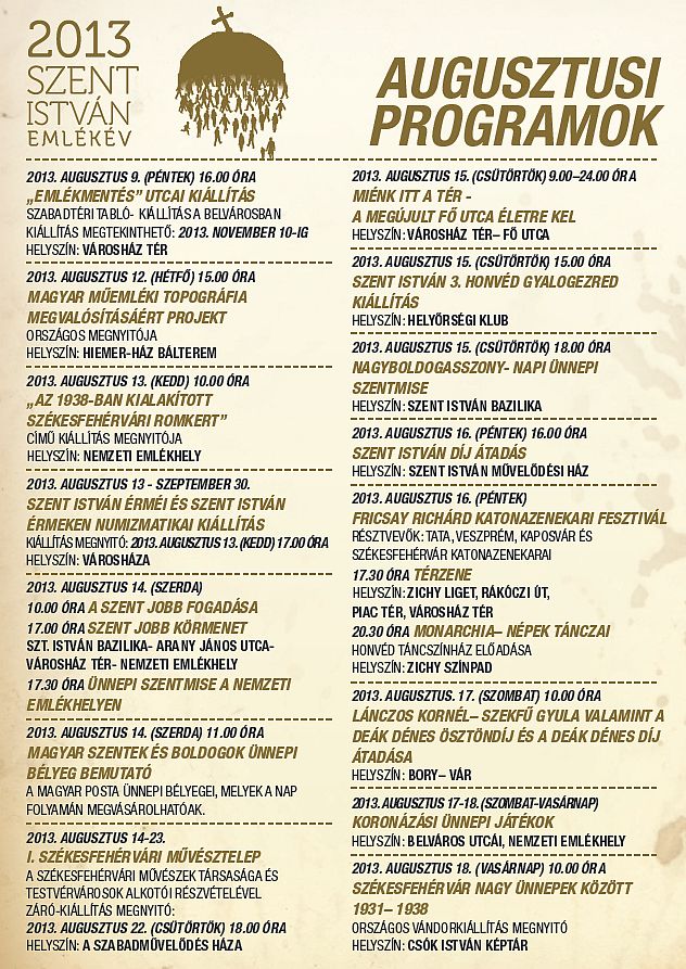 A 2013-as Szent István Emlékév augusztusi programjaira és a július 26-i Csitáry G. Emil szobor avatására invitálta a fehérváriakat Cser-Palkovics András polgármester és Csurgai Horváth József a 2013-as Emlékbizottság elnöke. Augusztus 14 és 24 között megannyi ünnepi program lesz Székesfehérváron, melyek a hazatérő Szent Jobb fogadásával kezdődnek. Augusztus 15-én lesz az új Fő utca avatása, augusztus 16-án katonazenekari fesztivál lesz a Zichy ligetben, 17-én és 18-án a Koronázási Ünnepi Játékok várják a látogatókat, 19-én Kormányülés és miniszterelnöki köszöntő lesz. Augusztus 20-án pedig a kenyérszentelés és Díszközgyűlés után kezdődik a XVIII. Nemzetközi Néptáncfesztivál.