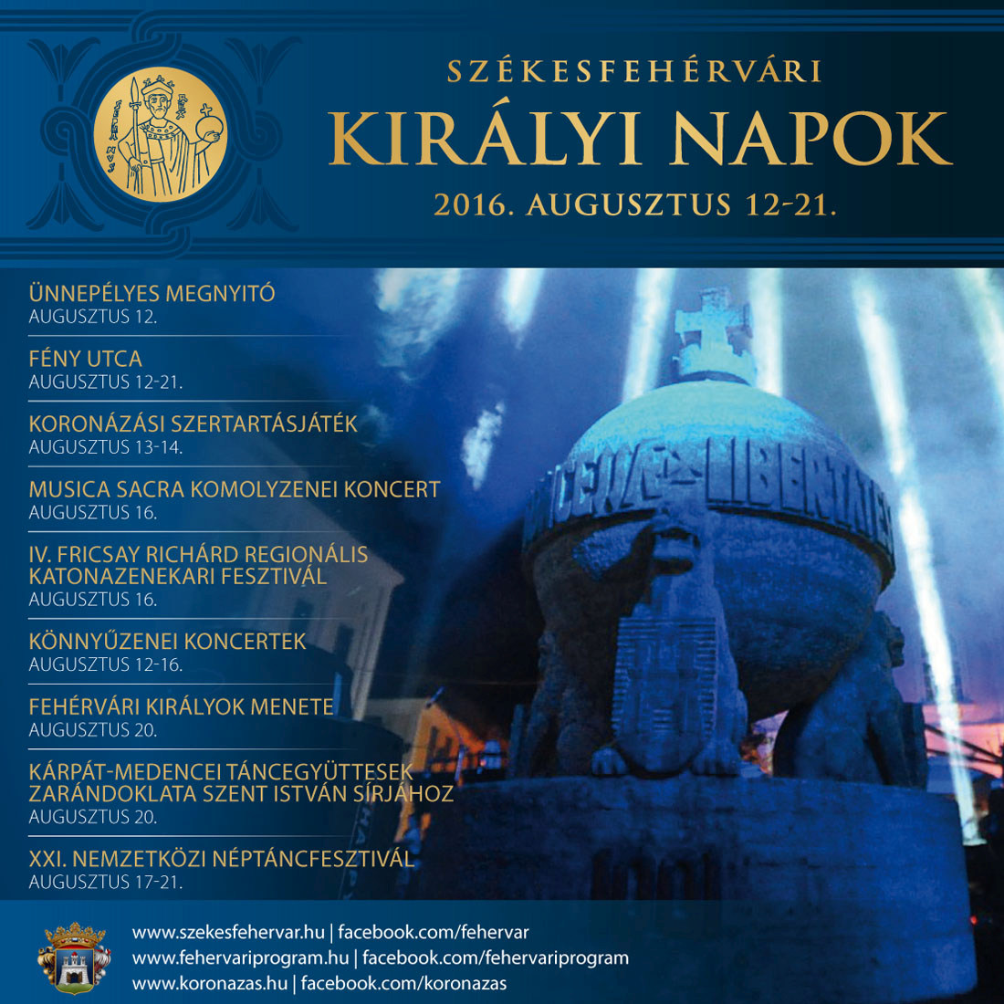 Esténként pedig megtörténik a varázslat: a Fő utca Fény utcává változik, ahol a házfalakra vetített gigantikus fénnyel festett mozgó történelmi képregényből ismerhetjük meg a királyi történeteket és legendákat. Augusztus 20-án az óriásbábok vezetésével hagyományőrzők és néptáncosok részvételével történelmi felvonulás és fergeteges néptáncos gálaesttel ünnepelünk, a programsorozat végén pedig a Nemzetközi Néptáncfesztiválra hozzánk érkezik a világ színes, táncos forgataggal.