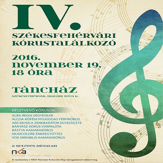 Az Alba Regia Vegyeskar negyedik alkalommal rendezi meg a Székesfehérvári Kórustalálkozót november 19-én 18 órakor a Táncházban. Az idei évben hét fellépő kórus közreműködésével valósul meg a hangverseny, melyre minden érdeklődőt szeretettel várnak. Fellép többek között a Vox Mirabilis Kamarakórus és a Várpalotai Bányászkórus is. A belépés díjtalan.