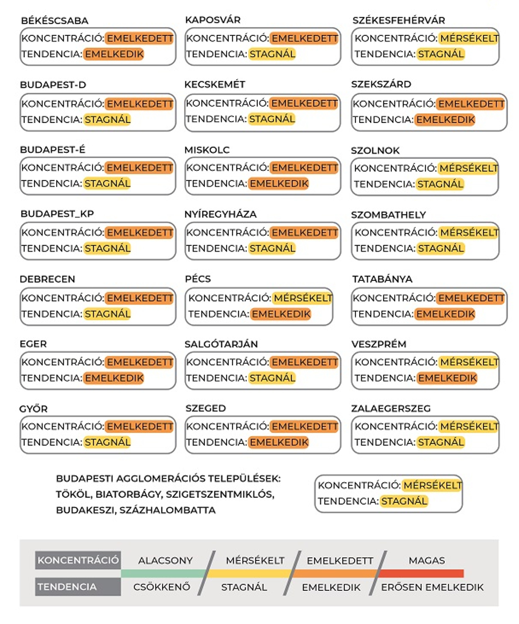 Tendencia tekintetében a vizsgált nagyvárosok közül Békéscsaba, Eger, Miskolc, Pécs, Szeged, Szekszárd, Tatabánya és Veszprém eredményeiben tapasztalható növekedés, csökkenés egyik vizsgált település esetében sem mérhető. A SARS-CoV-2 örökítőanyag koncentrációja 15 település esetében az emelkedett, míg 7 mintavételi helyen a mérsékelt kategóriába sorolható.