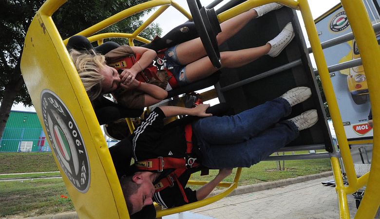 A Szent Flórián körúti Tesco áruház parkolójában következmények nélkül, pénteken estig bárki kipróbálhatja 8 és 18 óra között, hogy milyen érzés felborulni egy autóval.