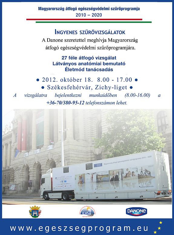 „A 2010-ben indult akciósorozat Magyarország legnagyobb humanitárius átfogó egészségvédelmi szűrőprogramja. Célja az egészség megőrzése, és a betegségek megelőzése, illetve kiszűrése az Európai Unióban is használatos korszerű diagnosztikai eszközökkel. Magyarországon 2010 és 2020 között éves szinten 125 helyszínen végeznek átfogó vizsgálatokat és adnak tanácsokat a program keretében. Székesfehérváron a Zichy ligetben, a Városi Levéltár előtti parkolóban 2012. október 18-án, csütörtökön 8 és 17 óra között várja az érdeklődőket a szűrőkamion.” – nyilatkozta a sajtótájékoztatón Östör Annamária egészségügyi és sporttanácsnok. Kiemelte, hogy a kamionon 27 féle átfogó vizsgálattal és látványos anatómiai bemutatóval, valamint életmód tanácsadással várják az érdeklődőket. Hangsúlyozta: október a Látás Hónapja, ezért a látásvizsgálat és a diabétesz-szűrés kiemelt szerepet kap. Östör Annamária elmondta továbbá, hogy a Danone és Székesfehérvár együttműködésének ez lesz a harmadik állomása. Korábban a nagyvállalat szerepet játszott a márciusi Női Egészségnapok megrendezésében és hasonló akcióra került sor júniusban Maroshegyen.