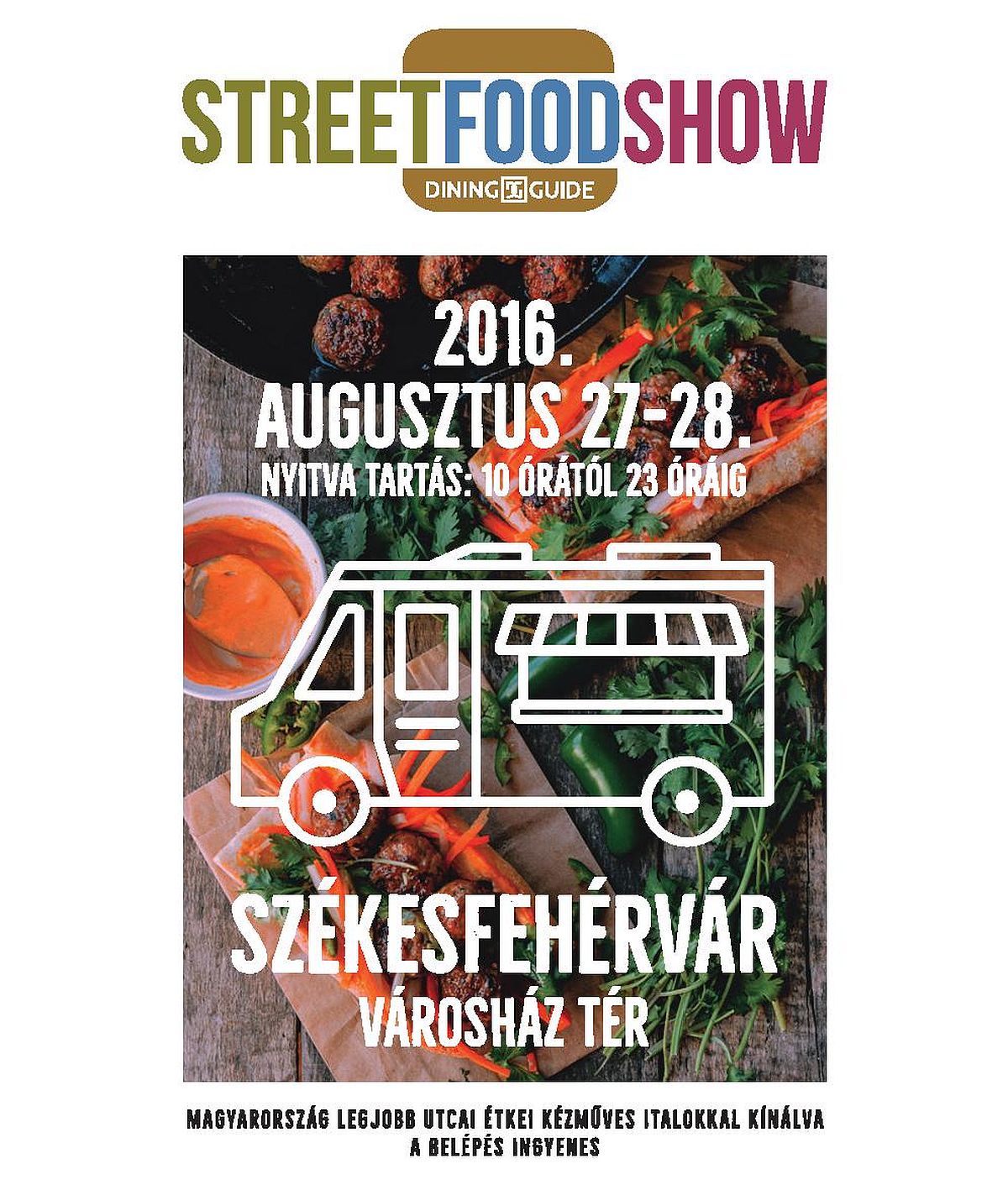 Augusztus 27-én és 28-án reggel 10 és este 11 óra között Székesfehérváron, a Városház Téren rendezik meg először vidéken az utcai étkek ünnepét, a Dining Guide Street Food Show-t. Grill szendvicsek, lepények, kolbászok, barbecue húsok, csülök, tócsni szendvicsek és persze a desszertek mellé jól csúsznak majd a kézműves italok.
