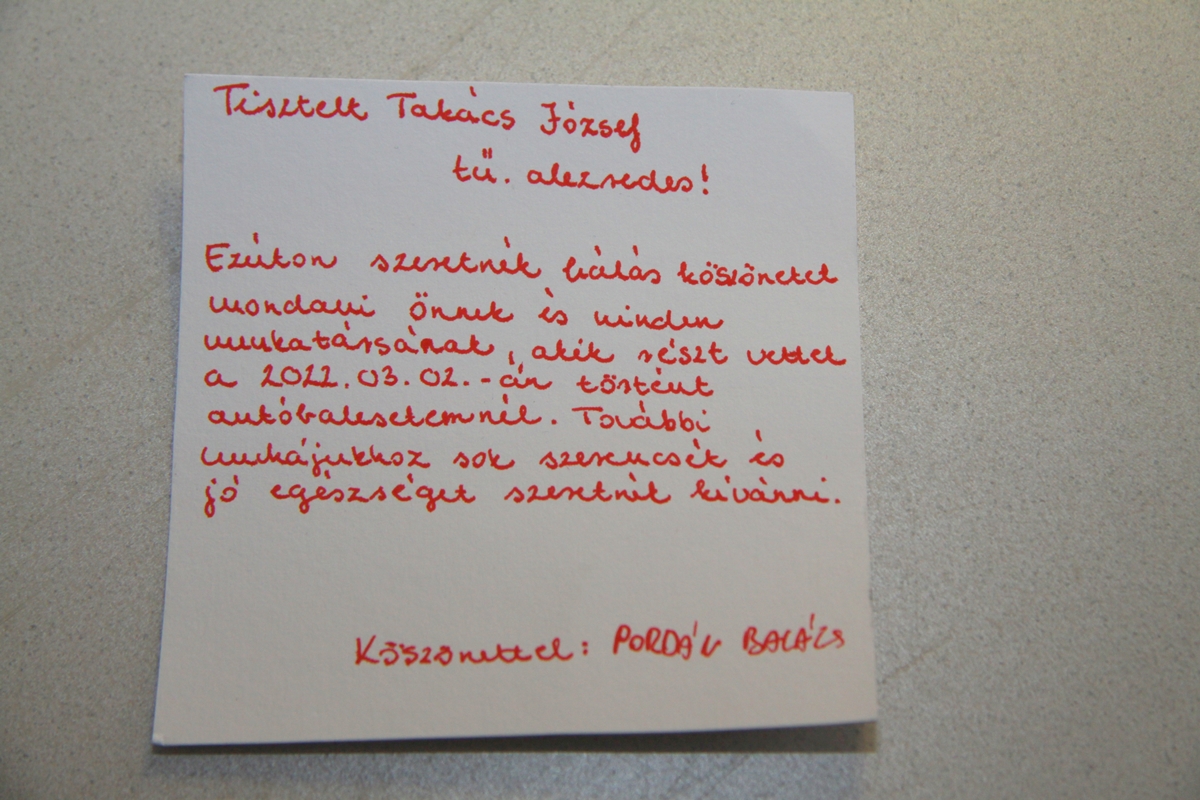 Sérüléseiből felépülve április 25-én ellátogatott a laktanyába, ahol egy személyes üzenet kíséretében köszönte meg a tűzoltóknak és a teljes „B” szolgálati csoportnak a gyors mentést. A fiatalembert elkísérte Várnai Dávid is, aki Balázs munkáltatójaként és a balesettel érintett személygépkocsi tulajdonosaként mondott köszönetet a tűzoltók gyors beavatkozásáért.