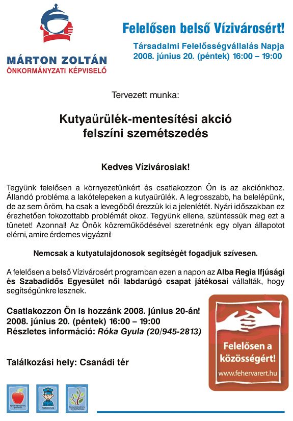 "Felelősen a belső Vízivárosért!" mottóval június 20-án pénteken takarítási akciót szerveznek a Vízivárosban. A programban szeretnék ha minél több lakó venne részt. A Csanádi, Radnóti és Pilinszky tér környékén is problémát jelent, hogy a kutyatulajdonosok közül többen nem szedik össze kedvencük ürülékét és nyáron intenzívebb szaga is lehet az ebek székletének. A délután négy és este hét óra közötti társadalmi munkával olyan állapotot szeretnének teremteni a Vízivárosban, amire érdemes lesz vigyázni.