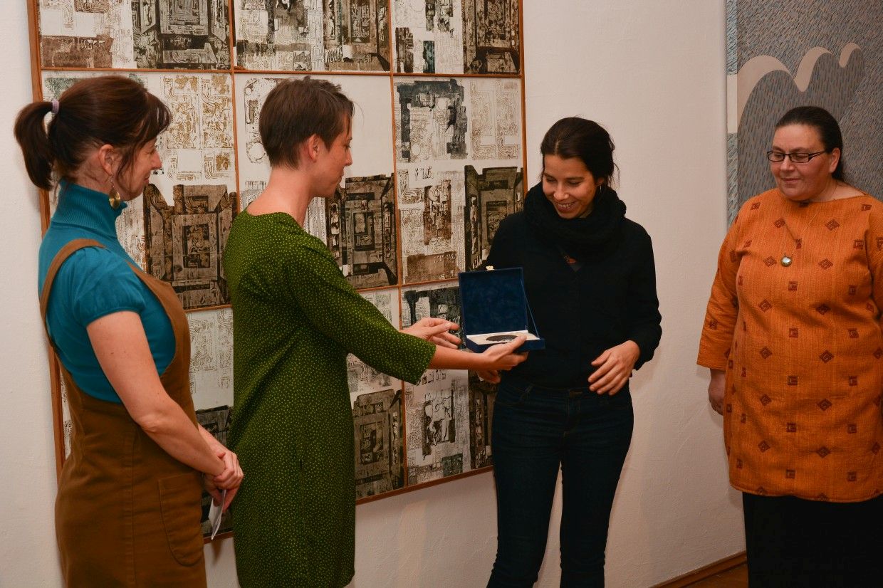 fotó: Pápai BarnaAz idei díjat Szemző Zsófia nyerte el, a kuratórium tagjai közül a díjátadón jelen volt Szűcs Erzsébet és Gärtner Petra művészettörténész is. Méltatásában Izinger Katalin művészettörténész kiemelte, hogy Szemző Zsófia alkotásainak témája a gazdasági és szociális válság. "Nem abban az értelemben társadalomkritikus, hogy aktuálpolitikai kérdésekre ad direkt válaszokat, hanem alternatívát és inspiráló víziót nyújt. Művészeti mintákat mutat fel társadalmi jelenségek megoldására, ösztönzi a személyes vonatkozások feltérképezését, és egyúttal élénkíti az ezekről való gondolkodást. A világ dolgaival, társadalomtudománnyal és tudománykritikával foglalkozik humorosan, játékosan és komolyan." - hangzott el a méltatásban.