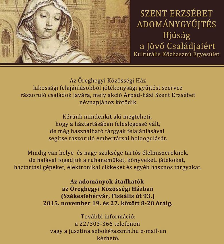 Árpád-házi Szent Erzsébet névnapjához kapcsolódóan a felajánlásokat november 19. és 27. között várják az Öreghegyi Közösségi Ház nyitva tartási idejében, hétfőtől péntekig 8.00 - 20.00 között (szombaton pedig délután és vasárnap délelőtt várják az adományokat). Az adományokat az Ifjúság a Jövő Családjaiért Kulturális Közhasznú Egyesület önkéntesei juttatják el a családoknak. (További információ: jusztina.sebok@aszmh.hu)