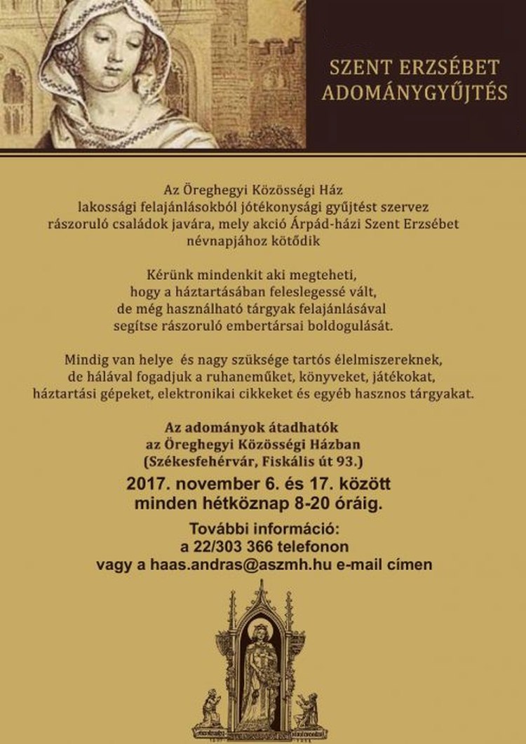 Árpád-házi Szent Erzsébet névnapjához kapcsolódóan a felajánlásokat november 6 és 17 között várják az Öreghegyi Közösségi Ház nyitva tartási idejében, hétfőtől péntekig 8.00 - 20.00 között várják az adományokat, amiket a Szegényeket Támogató Alapítvány önkéntesei juttatnak el a családoknak. A 303-366-os telefonszámon előre egyeztetett időpontban, hétvégén is várják a felajánlásokat.