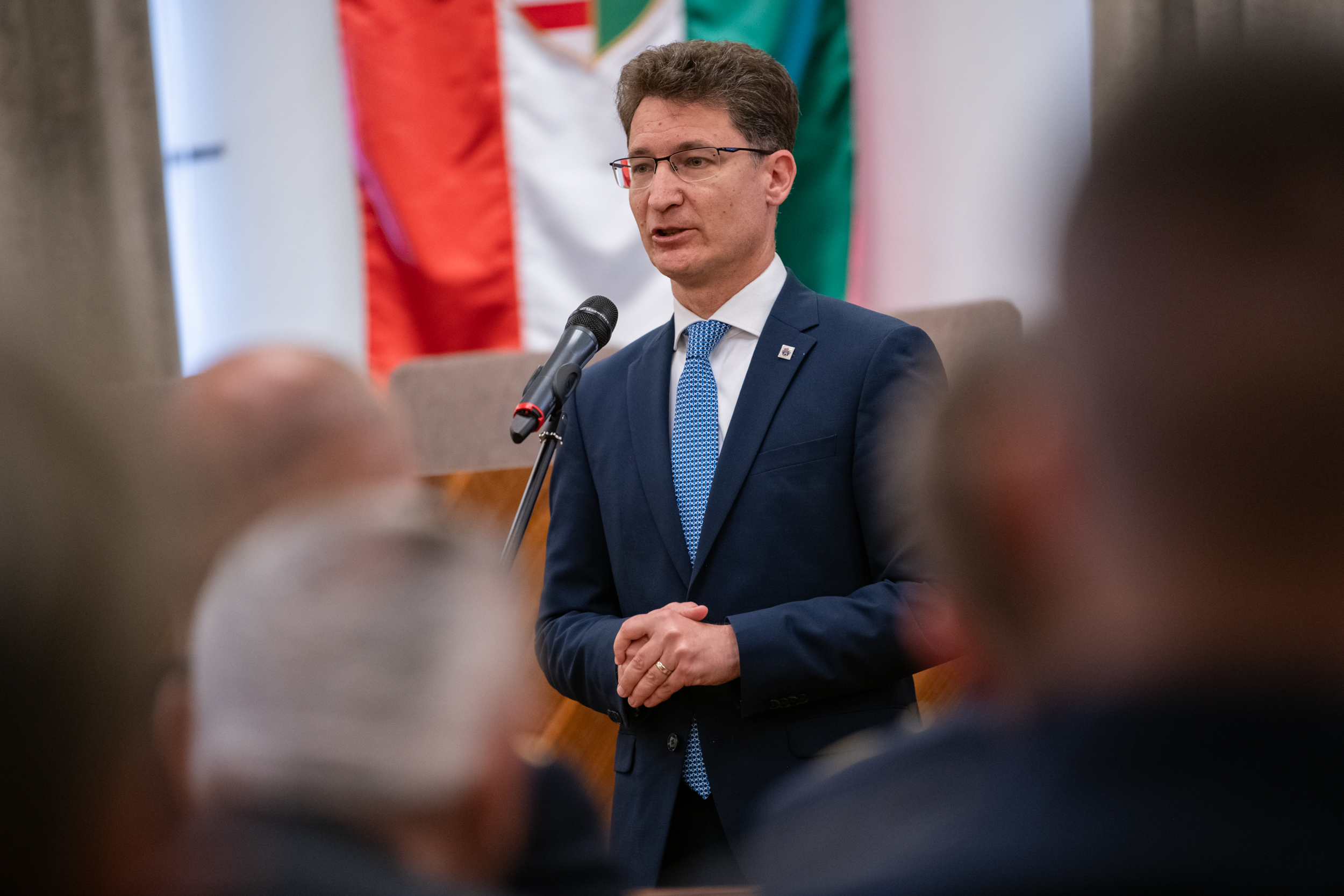 A rendőri állományt dr. Cser-Palkovics András polgármester köszöntötte, örömét kifejezve, hogy ismét a Díszterem adhat otthont az ünnepi alkalomnak. A teremben látható, Aranybulláról szóló festményhez kapcsolódva emlékeztetett: a középkori dokumentumot a Szent György-napi vásár idején bocsátották ki, így is kapcsolódik a mai esemény a város ezeréves történelméhez. „Bármely korszakról is beszélünk azonban, a biztonság mindig kulcskérdés volt, egy város közösségének nyugalmát mindig meghatározza a lakók biztonságérzete. Hálás vagyok, hogy jó emberi és szakmai együttműködésben tudjuk közös feladatainkat megvalósítani!” – fogalmazott a városvezető, aki szerint a 2025-ös lezárt év rendőrségi statisztikáit látva a világ bármelyik települése büszke lehetne. Ugyanakkor – tette hozzá –, az is látszik, hogy vannak még feladatok, különösen az online teret, az internetes csalásokat érintően, ahol a lakossági tájékoztatásnak fontos szerepe van.