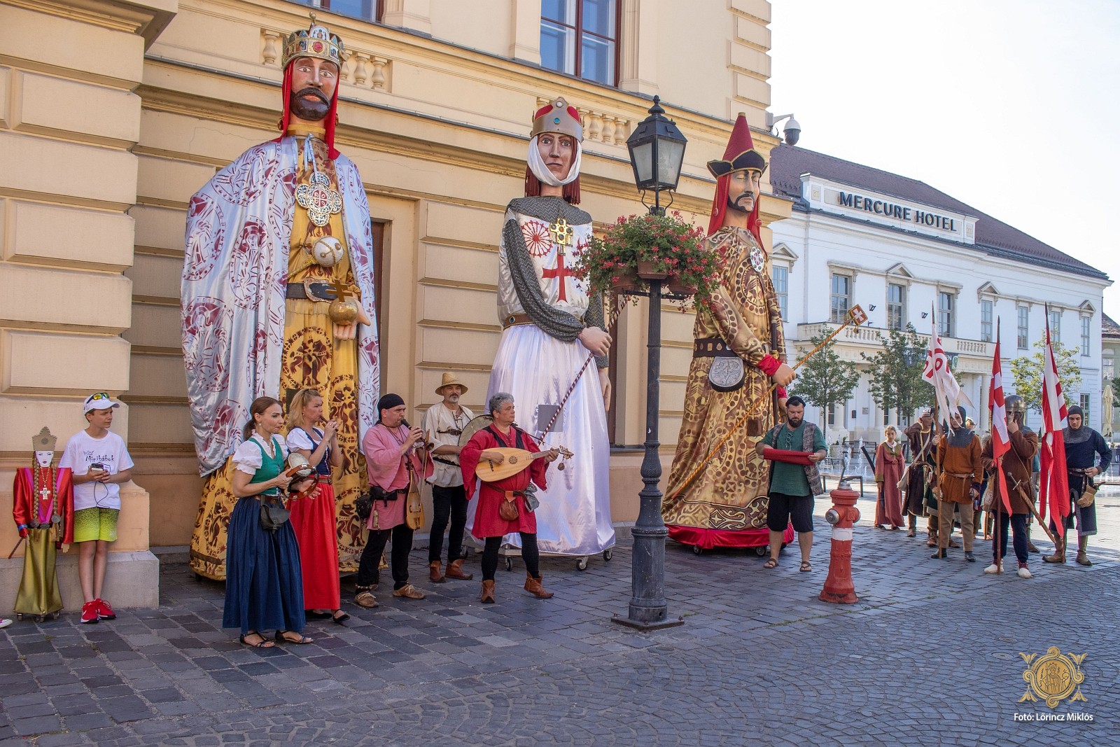 Az óriásbábokat ezúttal is hagyományőrzők, a Magyar Királyi Kardforgatók Rendje tagjai kísérik a Fő utcán, akik bemutatót is tartanak az Országalmánál.