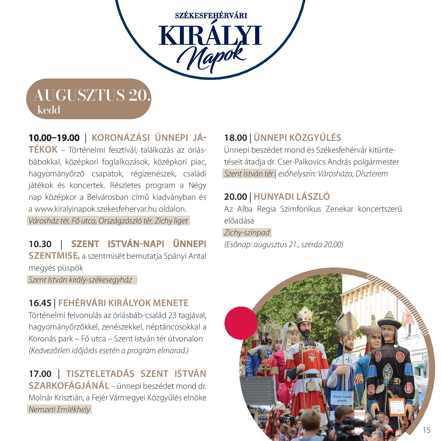 10.00 és 18.00 óra között utánozhatatlan középkori hangulattal várja vendégeit a Koronázási Ünnepi Játékok a Belvárosban. A Szent István-napi, az új kenyeret megáldó ünnepi szentmisét Spányi Antal megyés püspök celebrálja a Szent István-székesegyházban 10.30 órától.
