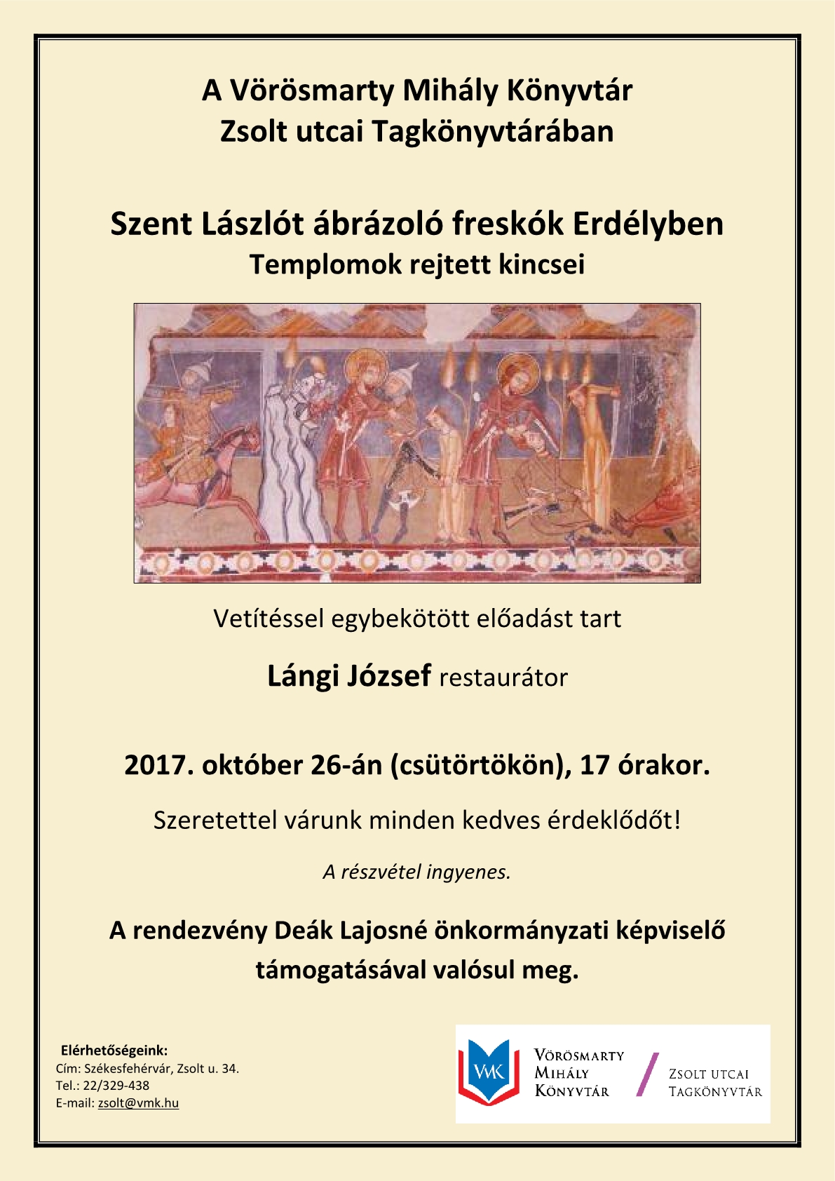 Október 26-án, csütörtökön 17 órakor Lángi József, restaurátor tart vetítéssel egybekötött előadást „Templomok rejtett kincsei – Szent Lászlót ábrázoló freskók Erdélyben” címmel a Vörösmarty Mihály Könyvtár Zsolt utcai Tagkönyvtárában. A részvétel ingyenes, szeretettel várnak minden érdeklődőt.