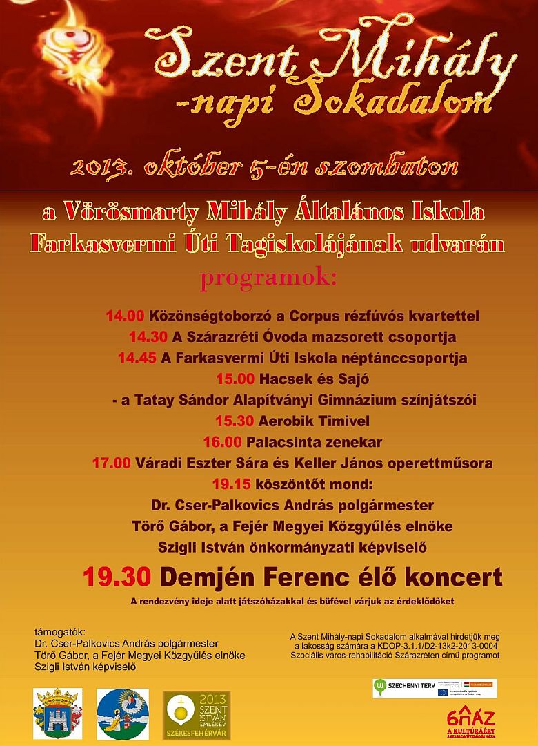 „A város-rehabilitációs projekt keretében felújítják az általános iskolát, ahol közösségi központot alakítanak majd ki, éppen ezért választottuk az intézmény udvarát a Szent Mihály-napi Sokadalom helyszínéül. A rendkívül nagy terület több ezer vendég befogadására alkalmas, így reméljük, hogy a Demjén koncertre érkezők is kényelmesen elférnek majd.” – mondta Kiss Dorottya, A Szabadművelődés Háza igazgatója. Kiemelte: a programokat lokálpatrióta módon állították össze, hiszen 14.00 órától a délután folyamán a helyi óvoda, és iskolák tanulói lépnek fel. 14.30 perctől lovaskocsi járja körbe Feketehegy-Szárazrétet, hogy invitálja a lakosságot a sokadalomra. Lesz aerobic bemutató, majd 17.00 órától operett összeállítással készül a Vörösmarty Színház két művésze, Váradi Eszter Sára és Keller János. Rövid technikai szünet után 19.15 perctől köszöntőt mond dr. Cser-Palkovics András polgármester, Törő Gábor, a Fejér Megyei Közgyűlés elnöke, valamint Szigli István képviselő, végül 19.30 órakor kezdődik Demjén Ferenc élő koncertje. A lakosság nyugalma érdekében 21.00 órakor zárják a programokat. A gépkocsival érkezők az iskolához közeli Lidl áruház parkolóját vehetik igénybe. A rendezvény helyszínét két bejáraton át – a Farkasvermi út és egy mellékutca felöl – lehet majd megközelíteni.