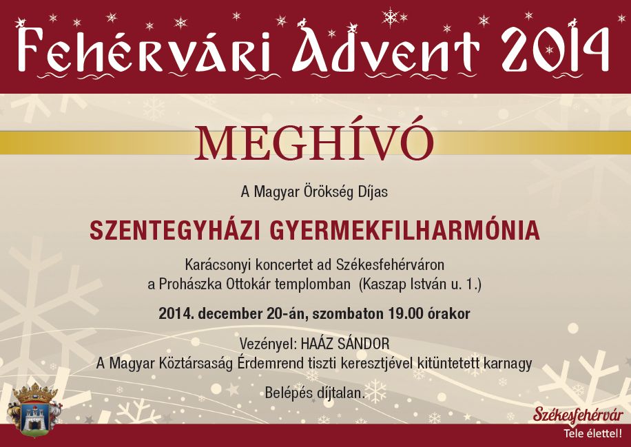 Székesfehérváron december 20-án, este hét órakor a Prohászka Ottokár templomban lép fel adventi turnéja keretén belül a Magyar Örökség díjas Szentegyházi Gyermekfilharmónia. Repertoárjukban eredeti népdalok, népdalfeldolgozások, történelmi énekek, valamint klasszikus darabok is szerepelnek.