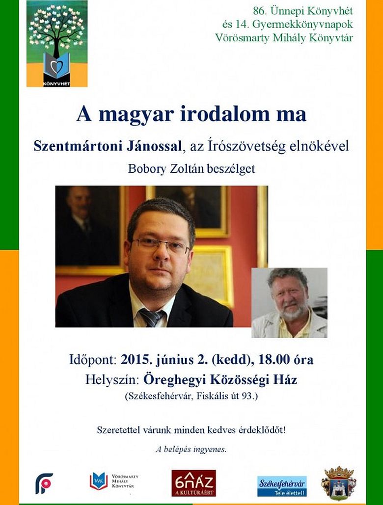 A 86. Ünnepi Könyvhét és 14. Gyermekkönyvnapok keretében számos érdekességgel várják az érdeklődőket június 1. és 10. között. 2015. június 2-án, kedden 18.00 órakor az Öreghegyi Disputa keretében Szentmártoni Jánossal, a Magyar Írószövetség elnökével Bobory Zoltán, a Vörösmarty Társaság elnöke beszélget. Az eseményre sok szeretettel várnak mindenkit.
