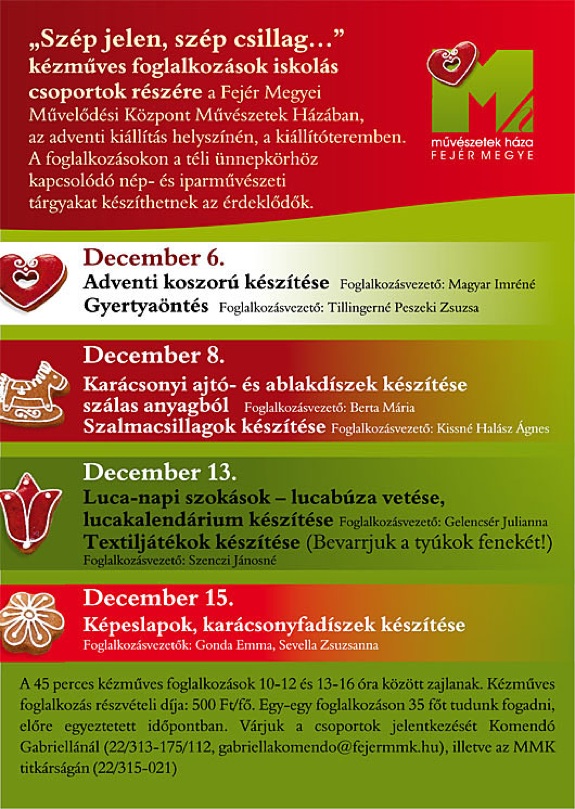 December 6. és 15. között minden kedden és csütörtökön „Szép jelen, szép csillag...” címmel kézműves foglalkozásokat szerveznek iskolás csoportok számára a Fejér Megyei Művelődési Központ Művészetek Háza kiállítótermében. A jelentkezők találkozhatnak a kiállításon látható alkotások készítőivel és megismerkedhetnek a téli ünnepkörhöz köthető neves napokkal, szokásokkal is.