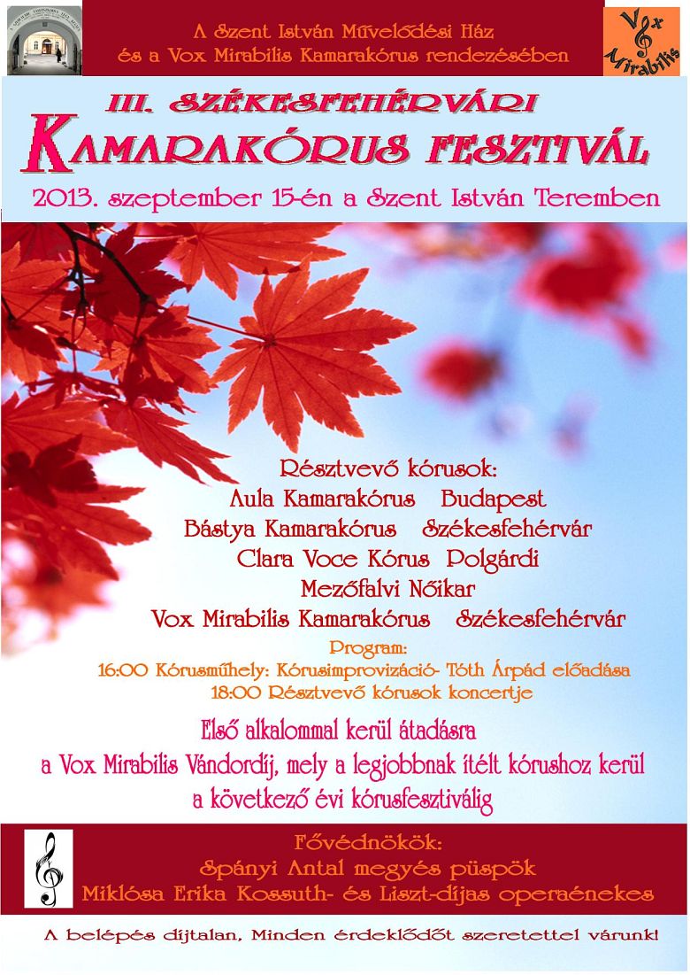 Szeptember 15-én tartják a III. Székes-fehérvári kamarakórus fesztivált, amit a Szakrális Művészetek Hete nyitórendezvényeként rendez a Vox Mirabilis Kamarakórus és a Szent István Művelődési Ház. A rendezvény fővédnökei: Spányi Antal megyéspüspök úr és Miklósa Erika Kossuth-díjas operaénekes.