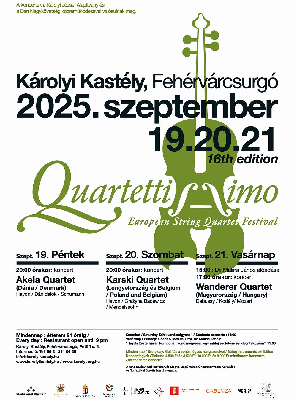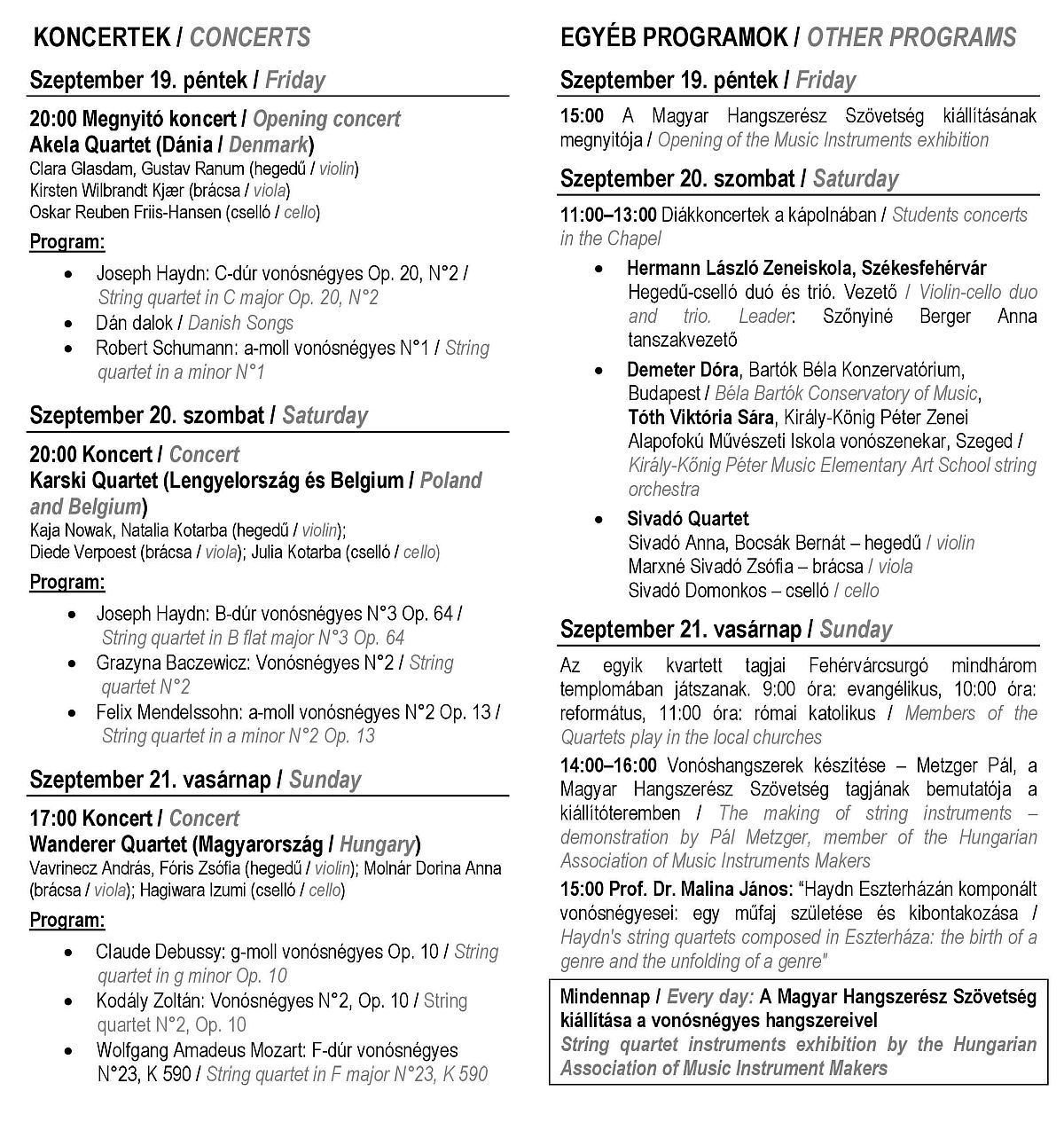 Szeptember 19-én, 20-án és 21-én a magyar Wanderer Quartet mellett fellép a dán Akela Quartet, amelynek koncertje szerepel a dán EU-elnökség programjában, valamint koncertet ad a lengyel-belga Karski Quartet. A zenetörténet terén idén különösen érdekes a vasárnap 15 órakor megrendezésre kerülő előadás, amelyet Prof. Dr. Malina János tart “Haydn Eszterházán komponált vonósnégyesei: egy műfaj születése és kibontakozása” címmel.