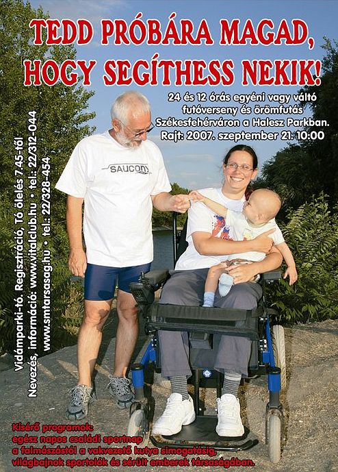 Jótékonysági 24 és 12 órás futást, valamint 24 órás teremkerékpározást rendeznek Székesfehérváron a Sclerosis Multiplexben szenvedők, valamint a sérült emberek javára, szeptember 21-én. A 19. Országos SM Nap zárórendezvénye lesz a Nagy Õszi Tóölelés és Örömfutás is. A rendezvényen Csorba Simon László festőművész - aki szintén vállalta, hogy futni fog - a résztvevőkkel együtt 10 méteres panoráma képet fest, László Péter István szobrászművész pedig 24 óra alatt mozgáshoz kapcsolódó szobrot készít. Szakáll Antal festőművész arra vállalkozott, hogy a futás ideje alatt rögtönzött karikatúrákat rajzol.