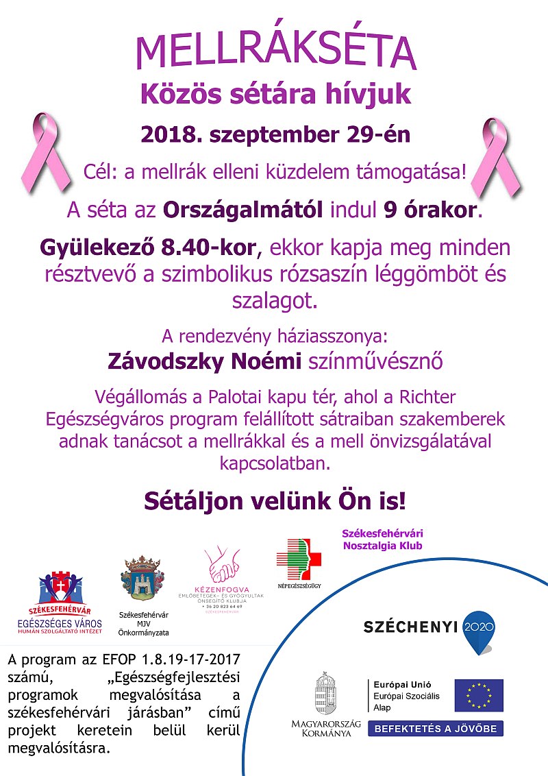 Az idei mellrák sétára Östör Annamária egészségügyi tanácsnok, Dr. Pásztor László, a Fejér Megyei Kormányhivatal Népegészségügyi Főosztály egészségfejlesztési koordinátora, Sebestyén Lászlóné a Nosztalgia NYugdíjas Klub vezetője és Habi Józsefné a Kézenfogva Onkológiai Klub vezetője közösen hívta a fehérváriakat.
