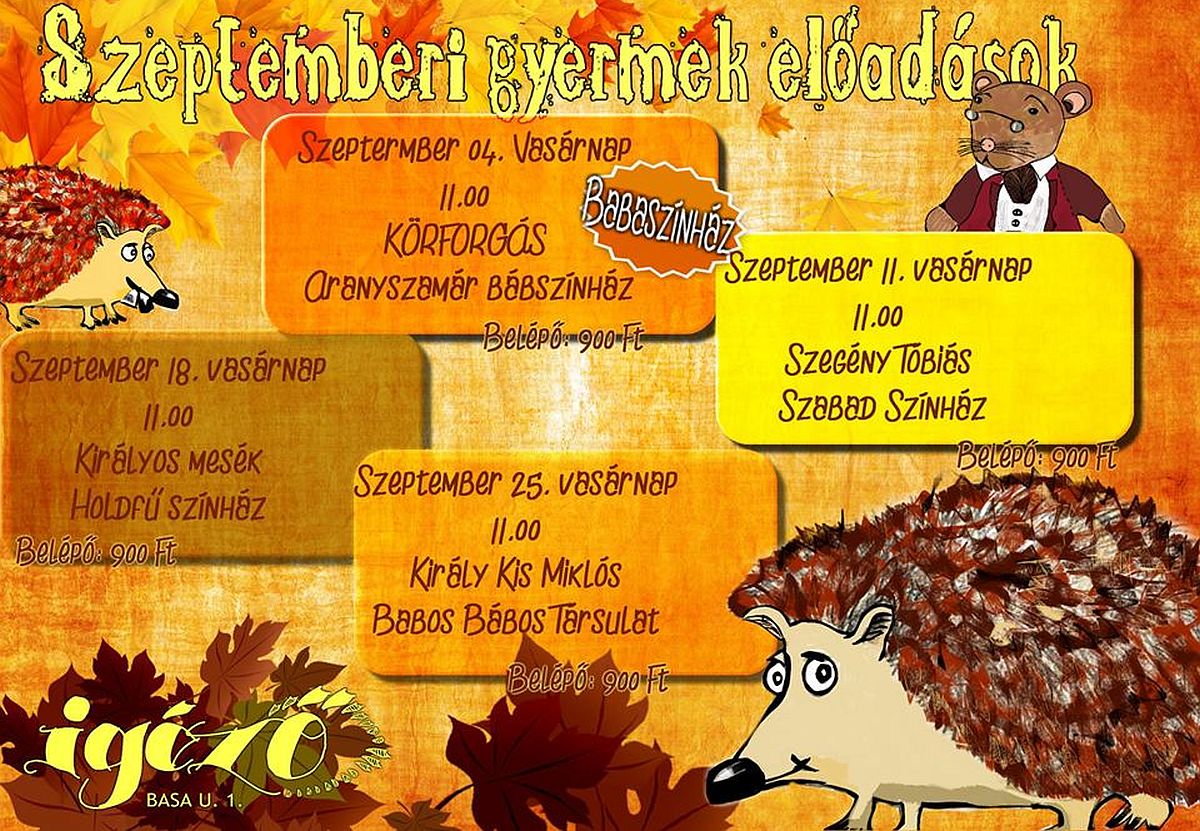 Vasárnap- onként 11.00 órától a gyerekeké az Igéző. Szeptemberben babaelőadásra, interaktív zenés bábelőadásra és királyos mesékre várnak minden érdeklődő apróságot, kisiskolást. Szeptember 4-én az Aranyszamár bábszínház KÖRFORGÁS című játékát 1-4 éves korú gyermekeknek ajánlják. Az előadásokra sok szeretettel várnak mindenkit!