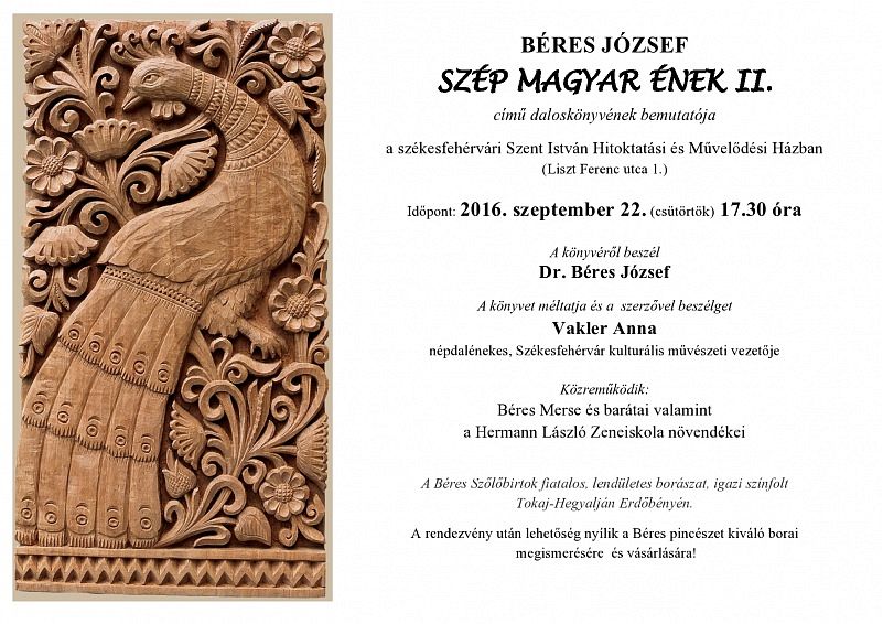 Szeptember 22-én, csütörtökön 17.30 órakor mutatják Dr. Béres József „Szép magyar ének II.” című daloskönyvét. A kiadványt méltatja és a szerzővel beszélget Vakler Anna népdalénekes, Székesfehérvár művészeti vezetője, közreműködnek Béres Merse és tanítványai, valamint a Hermann László Zeneművészeti Szakközépiskola és AMI növendékei.