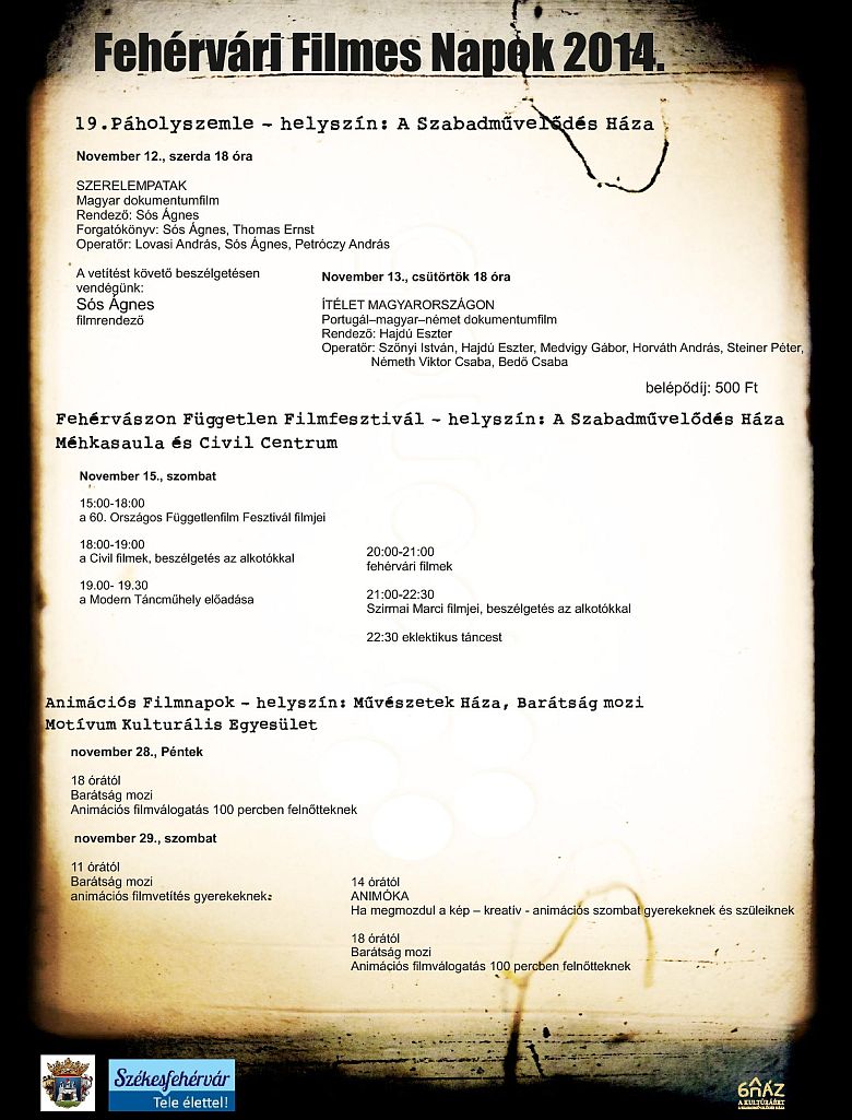 A szervezők ismét várják a filmrajongókat A Szabadművelődés Házába, ahol a Fehérvári Filmes Napok programjai már november 12-én, szerdán 18 órától elkezdődnek a Szerelempatak című filmmel. November 13-án, csütörtökön, szintén 18 órától az Ítélet Magyarországon című filmet lehet megnézni. A Filmes Napokon kívül a Fehérvári Független Filmfesztivált és az Animációs Filmnapokat is megszervezik, így két héten át peregnek majd a filmek a mozi kedvelőknek.