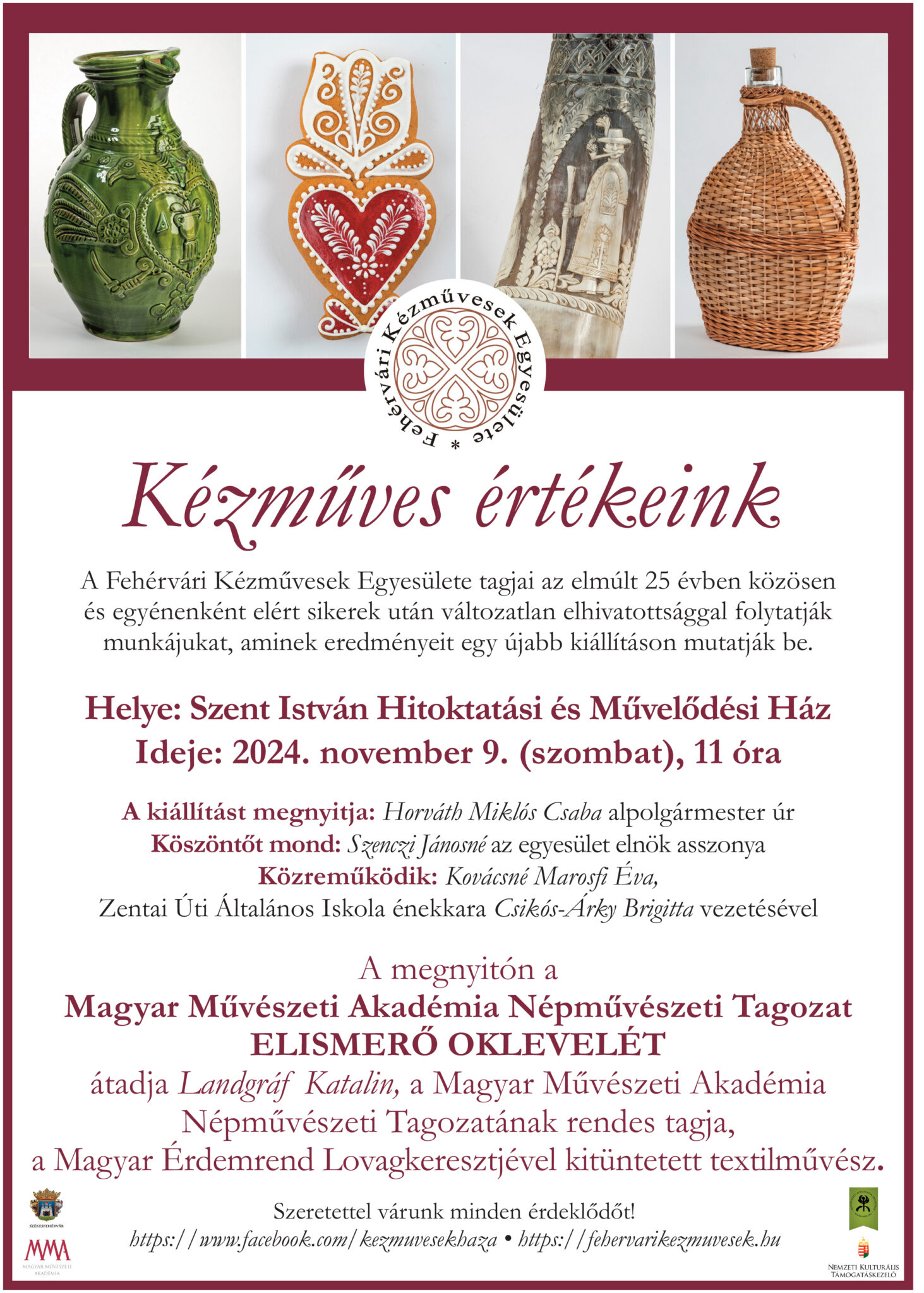 November 9-én (szombaton) 11.00 órakor nyílik meg a Fehérvári Kézművesek Egyesületének újabb, nagyszabású kiállítása abból az alkalomból, hogy a szervezet az eseményen átveszi a Magyar Művészeti Akadémia Népművészeti Tagozatának elismerő oklevelét.