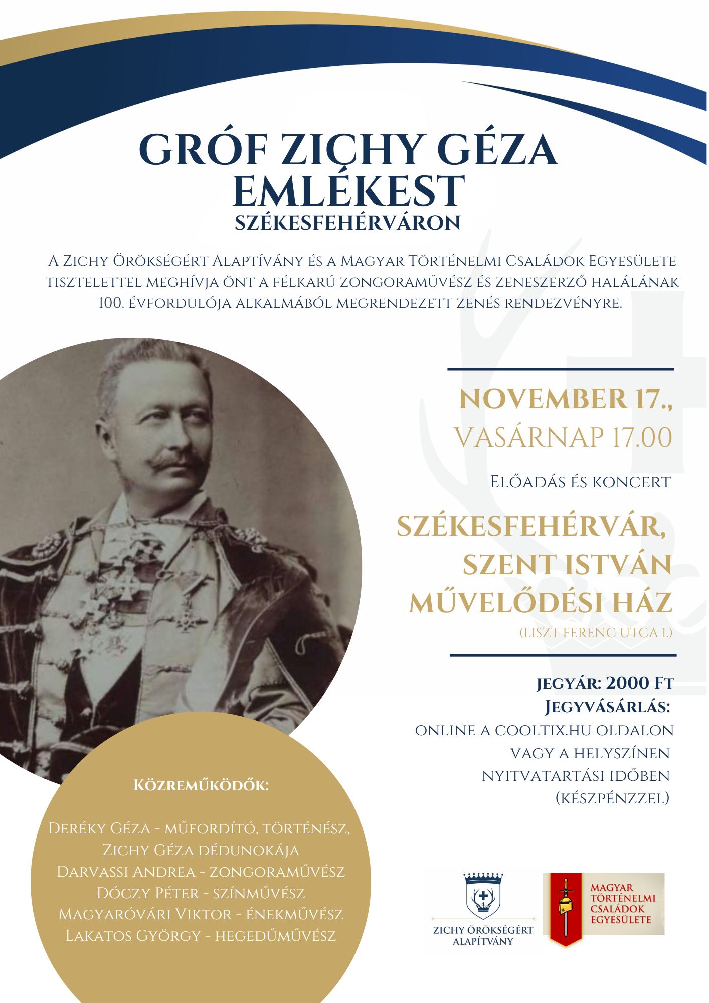 A Magyar Történelmi Családok Egyesülete és a Zichy Örökségért Alapítvány által szervezett kamarakoncerten felcsendülnek Zichy Géza művei, valamint a közönség egy előadást hallhat életéről, melyet egy-egy verse színesít majd. Az esten közreműködik Deréky Géza műfordító, történész, Zichy Géza dédunokája, Darvassi Andrea zongoraművész, Dóczy Péter színművész, Magyaróvári Viktor énekművész és Lakatos György hegedűművész.
