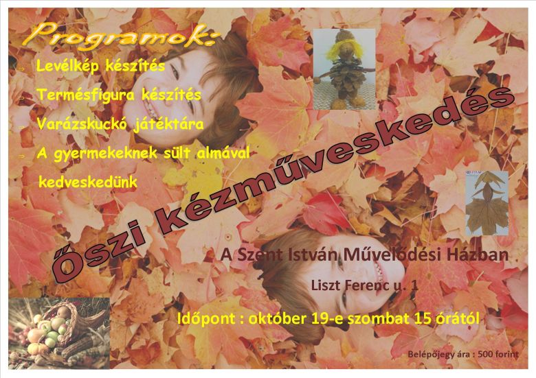 Az ősz jegyében zajló kézműves délutánra várják a családokat október 19-én, szombaton 15.00 órától a Szent István Művelődési Házban. A gyerekek készíthetnek őszi levélképeket és termésfigurákat, a Varázskuckó játékbolt pedig játéklehetőséget biztosít. A vendégeknek sült almával kedveskednek. A belépő 500 forint gyermekenként, a felnőttek számára a program ingyenes, a nyersanyagokat a szervezők biztosítják.