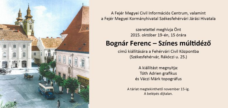 Bognár Ferenc - színes múltidéző címmel nyílik kiállítás a Fehérvári Civil Központban október 19-én hétfőn 15 órakor a Fejér Megyei Civil Információs Centrum és a Székesfehérvári Járási Hivatal szervezésében. A tárlatot, amely november 15-ig látható, Tóth Adrien grafikus és Váczi Márk topográfus nyitja meg.