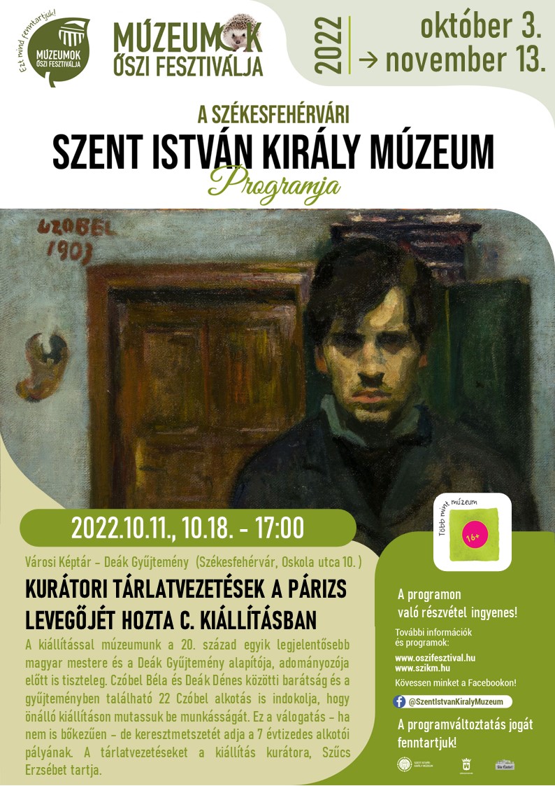 Izgalmas programokkal folytatódik a Múzeumok Őszi Fesztiválja a Szent István Király Múzeum tereiben. Október 11-én, kedden 17 órától Szűcs Erzsébet kurátor tart tárlatvezetést a Párizs levegőjét hozta Czóbel Béla alkotásait bemutató kiállításban a Városi Képtár–Deák Gyűjteményben.