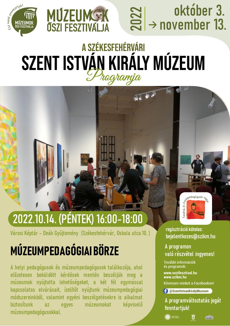Szintén ezen a napon 16 órakor a Városi Képtár – Deák Gyűjtemény ad otthont a Múzeumpedagógiai börzének. A helyi pedagógusok és múzeumpedagógusok találkozóján az előzetesen beküldött kérdések mentén beszélik meg a múzeumok nyújtotta lehetőségeket, a két fél egymással kapcsolatos elvárásait. A pedagógusok ízelítőt kapnak a múzeumpedagógiai módszerekből, valamint egyéni beszélgetésekre is alkalmat biztosítanak az egyes múzeumokat képviselő múzeumpedagógusokkal. A programon való részvételhez előzetes regisztrációt kérnek a bejelentkezes@szikm.hu e-mail címen.