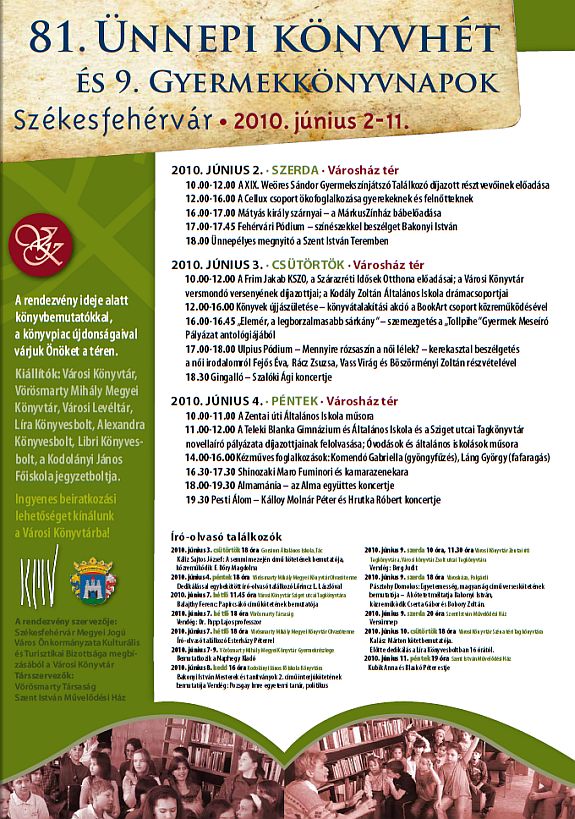 Számos író-olvasó találkozóra kerül sor, többek között Lőrincz L.Lászlóval találkozhatnak olvasói június 4-én pénteken 18 órától a Vörösmarty Mihály Megyei Könyvtár olvasótermében, június 7-én hétfőn 18 órától pedig ugyanitt Eszterházy Péter lesz a vendég.