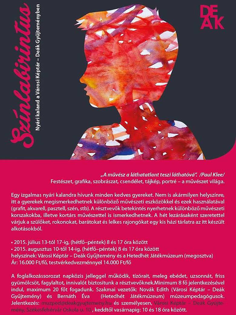 Egy izgalmas nyári kalandra hívnak minden gyermeket a Városi Képtár – Deák Gyűjtemény- ben. A programok során a gyerekek megismerkedhetnek különböző művészeti eszközökkel és ezek használatával (grafit, akvarell, pasztell, szén). A résztvevők betekintést nyerhetnek különböző művészeti korszakokba, illetve a kortárs művészetről is érdekes információkat kaphatnak.