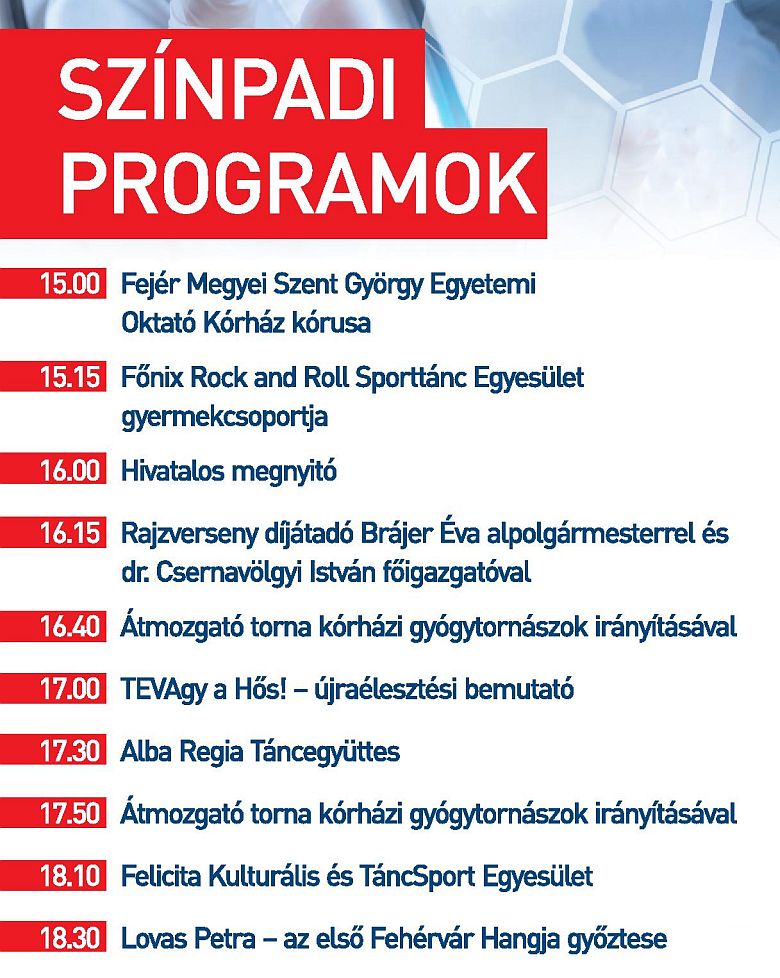 A rendezvényt a Fejér Megyei Szent György Egyetemi Oktató Kórház kórusa nyitja meg Tóka Szabolcs karnagy vezényletével 15.00 órakor. Előadásukat a Főnix Rock and Roll Sporttánc Egyesület gyermekcsoportjának bemutatója követi. 16.00 órakor a „Szívügyünk Fehérvár” egészségügyi szűrőnap fővédnökei – dr. Cser-Palkovics András polgármester, Vargha Tamás államtitkár, Törő Gábor országgyűlési képviselő – és dr. Csernavölgyi István köszöntik az egybegyűlteket, majd a főigazgató úrral Brájer Éva alpolgármester kihirdeti A Szabadművelődés Háza rajzpályázatának eredményét. A díjátadó után a kórház gyógytornászai átmozgató tornákat, a TEVAgy a Hős! – Klupács Péter mentő-technikus és Mészáros Zalán mentőtiszt – újraélesztési bemutatót tartanak. A közönséget a délután második felében az Alba Regia Táncegyüttes, a Felicita Kulturális és TáncSport Egyesület, valamint a Fehérvár Hangja első győztese, Lovas Petra szórakoztatja.