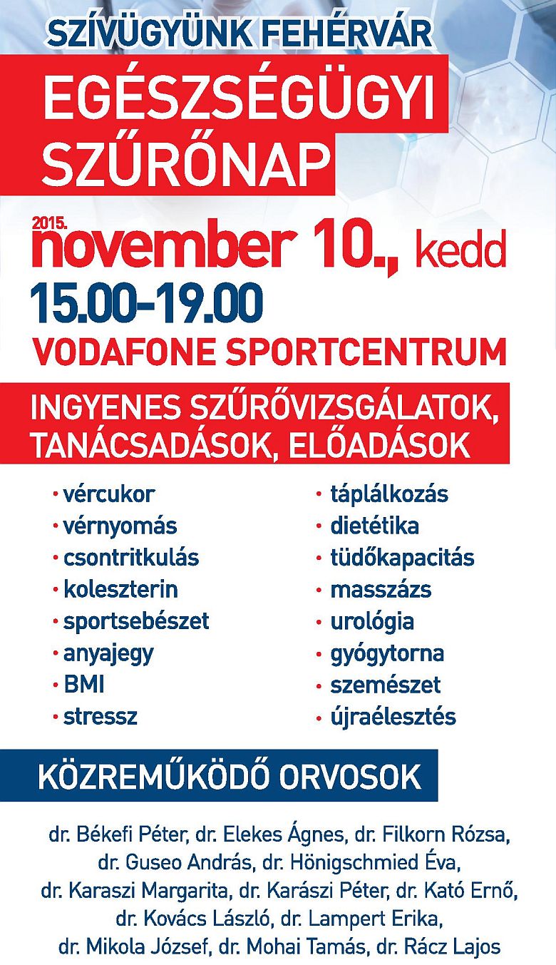 Székesfehérvár Megyei Jogú Város Önkormányzata és a Fejér Megyei Szent György Egyetemi Oktató Kórház november 10-én rendezi meg a „Szívügyünk Fehérvár” hagyományos egészségügyi szűrőnapot a Vodafone Sportcentrumban. Városunk ismert és elismert szakemberei a különféle ingyenes szűréseken, méréseken, tanácsadásokon nemcsak a betegségek megelőzésére, hanem az időbeni kezelés fontosságára is felhívják a látogatók figyelmét.