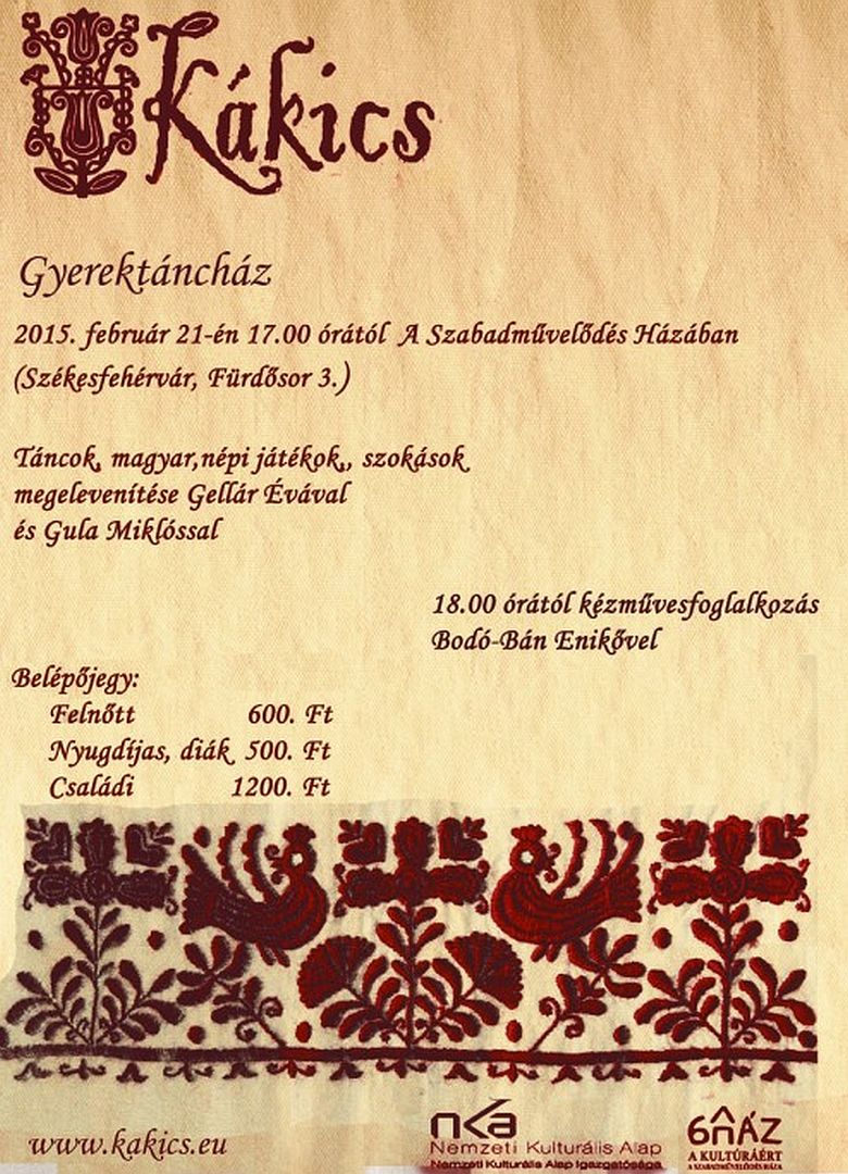 Február 21-én ismét táncházba invitál a Kákics zenekar. Ez alkalommal A Szabad- művelődés Háza ad helyet a programnak. A program 17 órakor kezdődik gyerek táncházzal, Gellár Évával és Gula Miklóssal, akik népi játékokkal, szokások megelevenítésével bírják mozgásra az ifjúságot. Ezt követően a nagyoknak 18 órától szervezek Csángó táncházat.