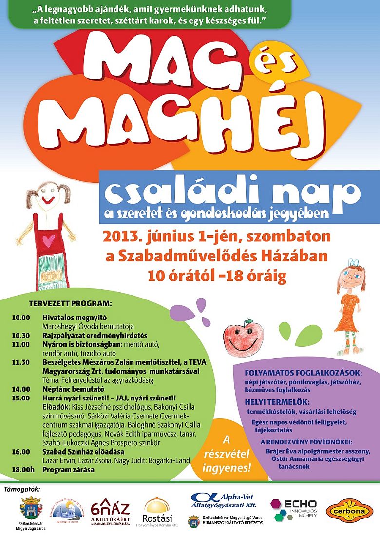 Mag és Maghéj címmel családi napot tartanak június 1-jén szombaton A Szabadművelődés Házában és környékén. A gyerekek játékos foglalkozásokon, szüleik pedig neveléssel, lelki fejlődéssel kapcsolatos szakmai előadásokon vehettek részt. A programot kisgyermekes anyukák kezdeményezték. Sok helyről sokféle információ eljut a kisgyermekes szülőkhöz, ezek azonban nem mindig hitelesek. A szervezők éppen ezért helyi szakembereket kértek fel az előadásokra. 15 órától Hurrá nyári szünet - JAJ, nyári szünet! címmel rendeznek beszélgetést, amelyen részt vesz többek között Kiss Józsefné pszichológus, Bakonyi Csilla színművésznő és Baloghné Szakonyi Csilla fejlesztőpedagógus is.