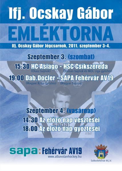 Idén már harmadszorra rendezik meg Fehérváron az ifj. Ocskay Gábor Emléktornát. A rendezvény szeptember 3-án (szombaton) 15:30-kor az olasz bajnok HC Asiago és a román bajnok, MOL Liga győztes HSC Csíkszereda mérkőzésével indul. Az emléktorna idei lebonyolítása nem körmérkőzéses, hanem "kieséses" rendszerben történik.