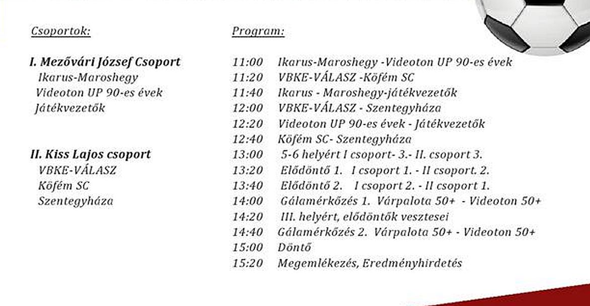 „A két egyesület közösen szervezi a tornát Mezővári József és Kiss Lajos emlékére, hat olyan csapat részvételével, amelyek közül öt kötődött a két kiváló sportember pályafutásához, a Szentegyháza Vasas SC pedig, mint baráti csapat Székelyföldről érkezik.” - emelte ki Juhász László, a Videoton FCF Baráti Kör Egyesület alapítója.