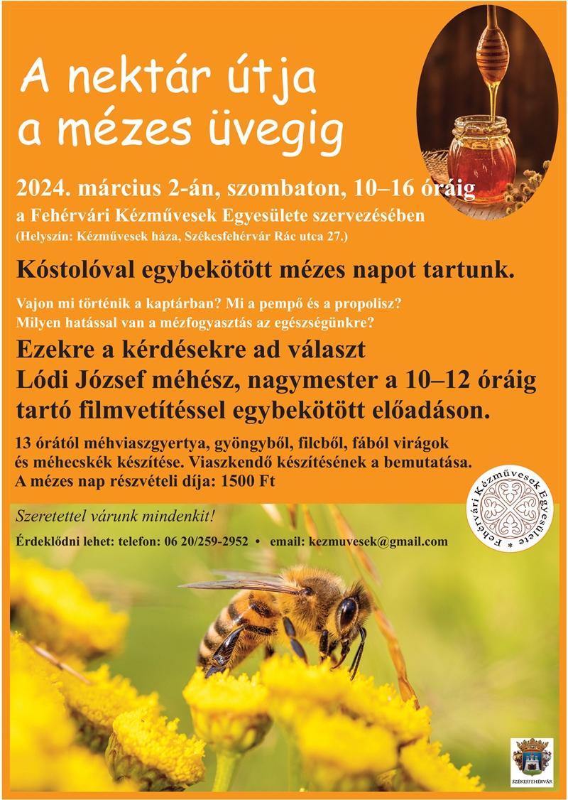 Kóstolóval egybekötött Mézes Napot tart március 2-án, szombaton a Fehérvári Kézművesek Egyesülete. Az eseményen Lódi József méhészmester filmvetítéssel egybekötött előadást tart, valamint mézes kézműveskedésre is sor kerül.