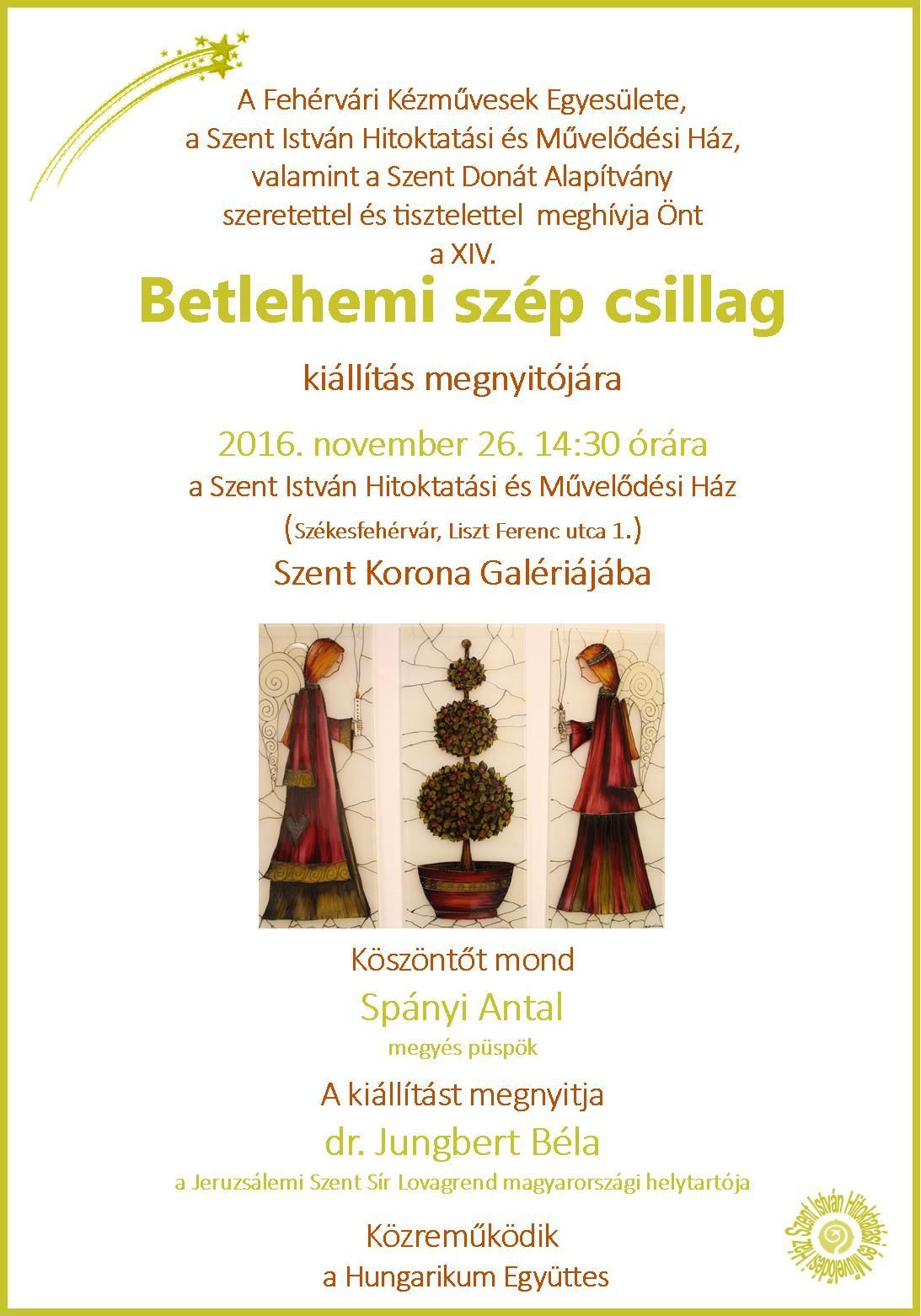 A XIV. Betlehemi szép csillag kiállítás megnyitójával kezdődnek szombaton a Belváros adventi programjai a Szent István Hitoktatási és Művelődési Házban. A szép hagyományokkal bíró rendezvényen Spányi Antal megyés püspök mond köszöntőt, a kiállítást Jungbert Béla, a Jeruzsálemi Szent Sír Lovagrend magyarországi helytartója nyitja meg. A látogatókat a Fehérvári Kézművesek Egyesülete az angyalok tárlatával is szeretettel várja az adventi időszakban!