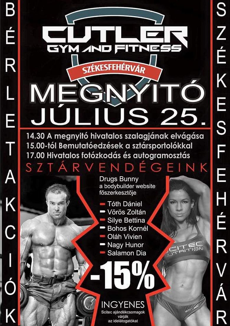 2015. július 25-én, szombaton délután 14.30-kor kerül sor a székesfehérvári Cutler Gym and Fitness hivatalos megnyitójára és az ünnepélyes szalagátvágásra a Balatoni út 2. szám alatt (volt Stop Étterem helyén). A megnyitó után bemutató edzések, valamint hivatalos fotózkodás és autogramosztás következik. A sportos programot sztárvendégek jelenléte is színesíti.