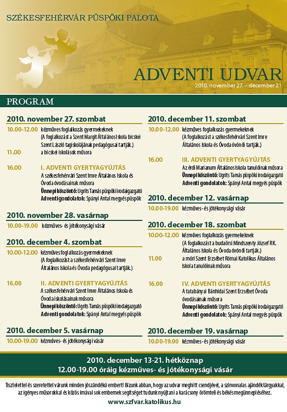 | November 27-én, szombaton kezdődnek az adventi udvari programok. Délelőtt 10 órától kézműves és jótékonysági vásárral várnak mindenkit. A gyerekeknek pedig karácsonyfadísz készítést szerveznek. A foglalkozást a tatabányai Szent Margit Általános Iskola bicskei Szent László tagiskolájának pedagógusai tartják, majd diákjai 11 órakor műsort adnak elő. Délután négy órakor kezdődik a I. adventi gyertyagyújtás a székesfehérvári Szent Imre Általános Iskola és Óvoda óvodásainak műsorával. Ugrits Tamás püspöki irodaigazgató ünnepi köszöntője után pedig Spányi Antal megyéspüspök adventi gondolatai következnek. Az ünnepség imával zárul. |