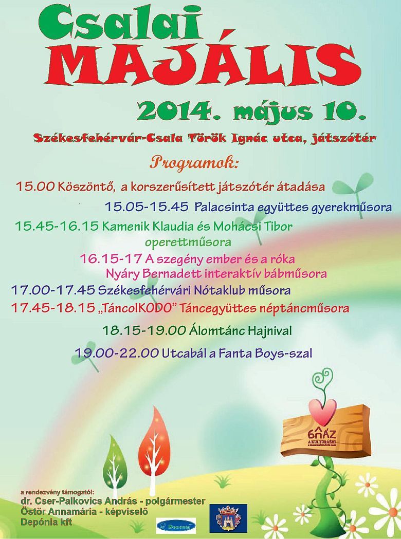 Harmadik alkalommal rendezik meg május 10-én, szombaton a Csalai Majálist. A rendezvény 2012-ben indult útjára, hagyományteremtő és közösségépítő szándékkal. A programok között minden korosztály talál kedvére valót, családi programként is méltán megállja a helyét. A dr. Cser-Palkovics András polgármester, Östör Annamária önkormányzati képviselő és a Depónia Kft. támogatásával megvalósuló rendezvényen kerül átadásra a korszerűsített játszótér is.